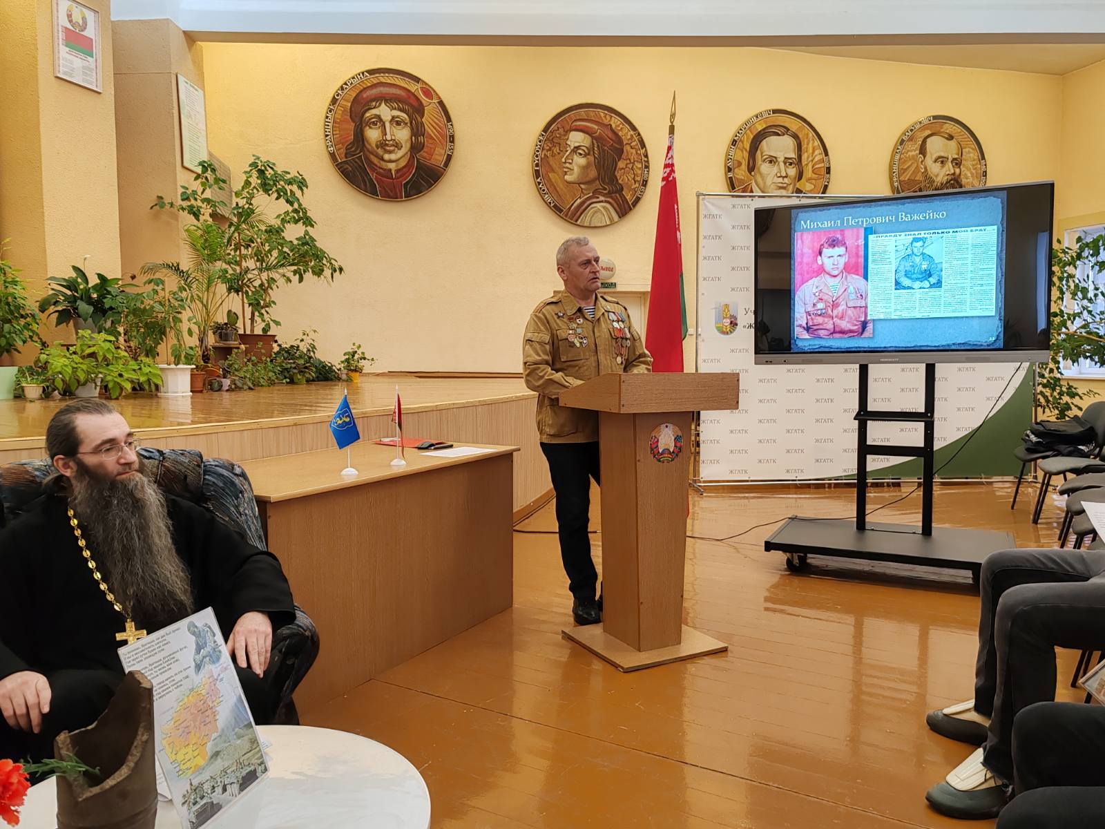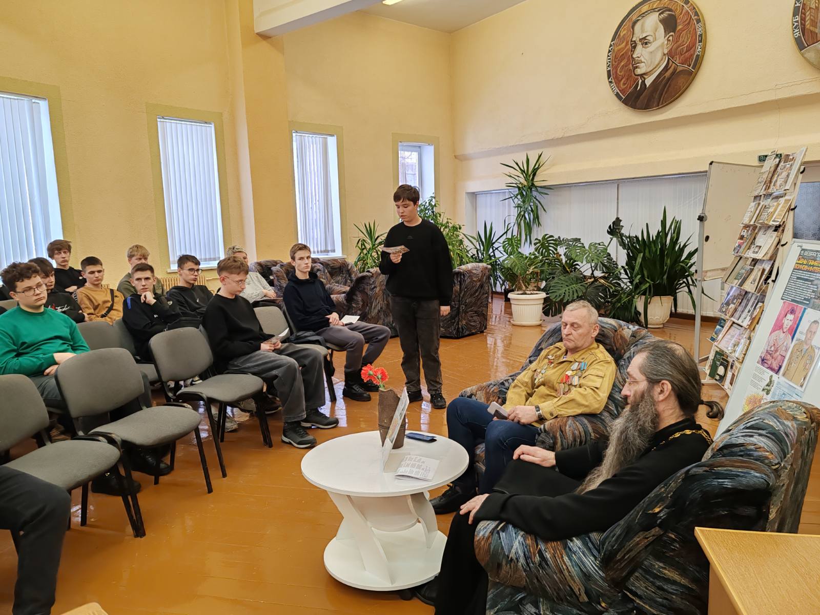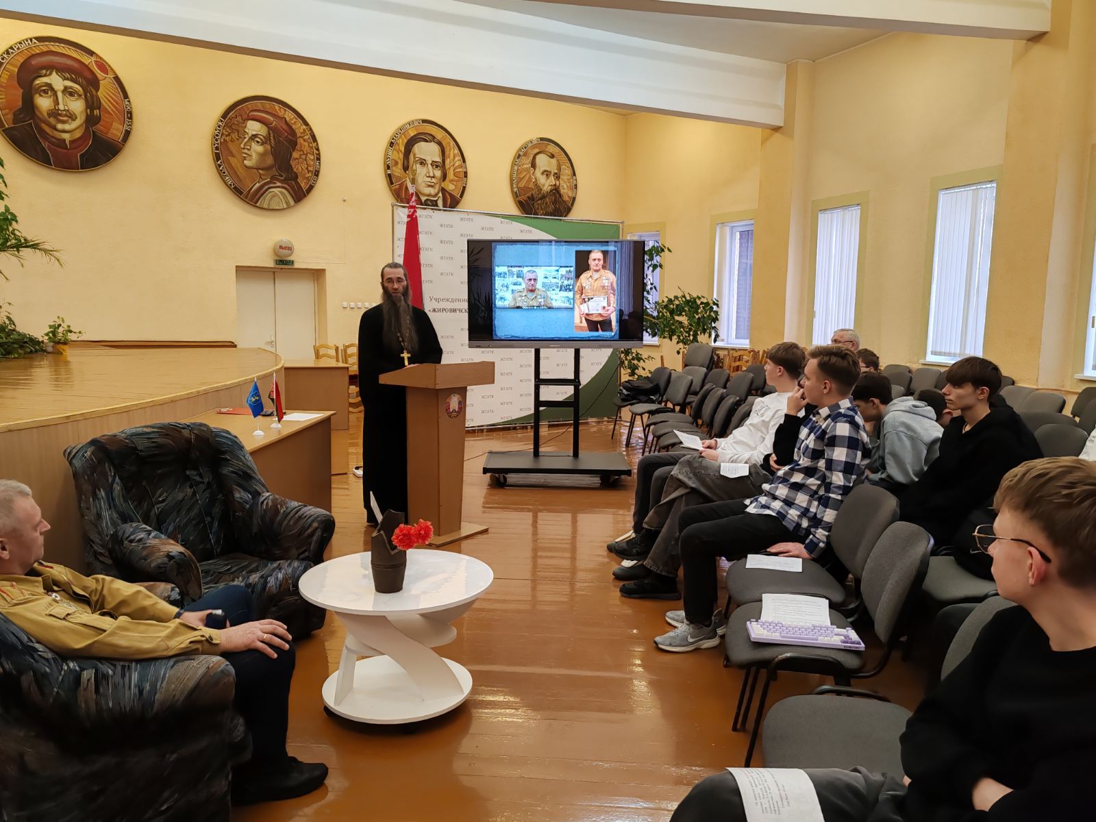 12 февраля в Зале заседаний нашего колледжа прошла встреча учащихся групп 43э и 78м, а также членов православного клуба «Пересвет» с воином-интернационалистом, Кавалером ордена Красной Звезды, десантником, горным стрелком, преподавателем физического воспитания нашего колледжа Михаилом Петровичем Важейко. На встрече присутствовал так же иеромонах, насельник Жировичского Свято-Успенского монастыря отец Николай (Чеботарёв). Встреча была приурочена к 37-й годовщине вывода Советских войск из Афганистана. Ребята познакомились с особенностями этой страны, узнали об участии Советского Союза в войне 1979-1989 годов, с интересом слушали рассказ своего преподавателя о его боевой биографии. Закончилась встреча рассуждением о духовности на войне, о патриотизме и готовности защищать Родину. Ребята о многом узнали и о многом задумались. А значит, всё было не зря.
