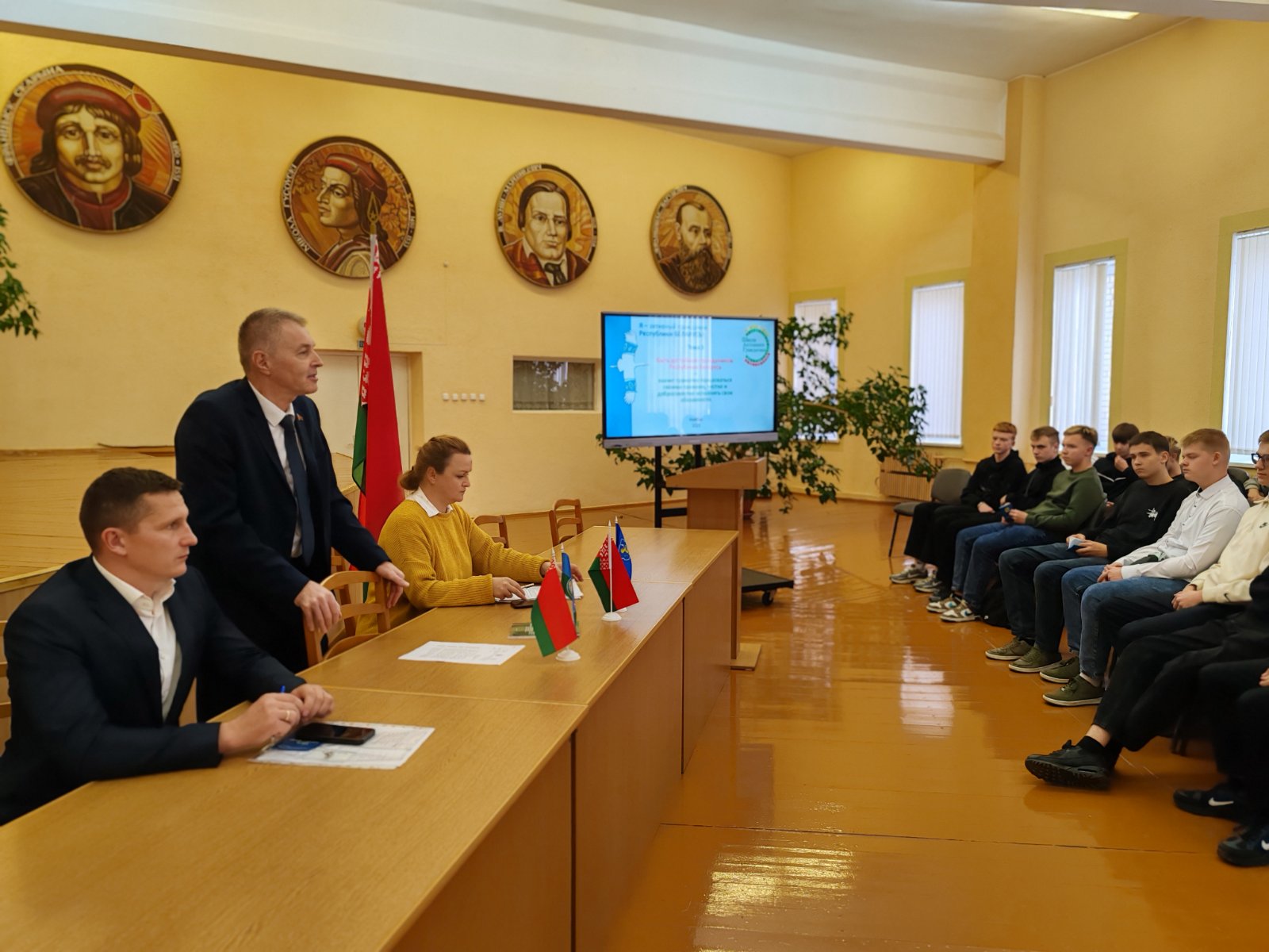 27.11.25 г. в Овальном зале колледжа прошло очередное заседание образовательного проекта ШАГ. Тема звучала так: «Быть достойным гражданином Республики Беларусь - значит грамотно пользоваться своими правами, честно и добросовестно исполнять свои обязанности». Гостем и экспертом по вопросу соблюдения прав работающих граждан был председатель Районного комитета профсоюза работников АПК Александр Николаевич Зинченко. Он рассказал ребятам о профсоюзном движении, преимуществах членства в профсоюзной организации, защите прав работников, их оздоровлении и бонусах, например, в виде новогодних подарков детям. Но не только права граждан были темой обсуждения, но и их обязанности.