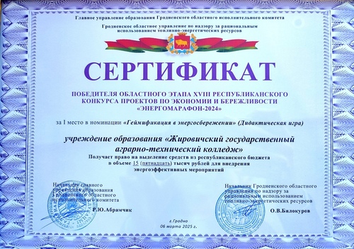 1 место в номинации «Геймификация в энергосбережении», подноминация «Дидактическая игра» заняли учащиеся 3 курса Рулинский Артем, Соболевский Владислав, руководители Ракевич Денис Алексееевич, Шухно Андрей Александрович;